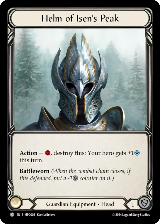 - Action - {r}, destroy Helm of Isen Peak: Your hero gains +1{i} until end of turn. Battleworn