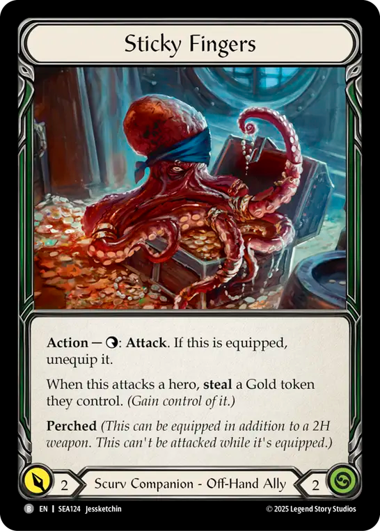 - Action - {t}: Attack. If this is equipped, unequip it. When this attacks a hero, steal a Gold token they control. Perched