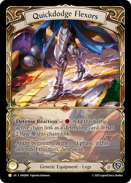 - **Defense Reaction** -- {r}: Add this to the active chain link as a defending card. It has 2 base {d} this chain link.{br}At the beginning of the end phase, if this defended this turn, destroy it.