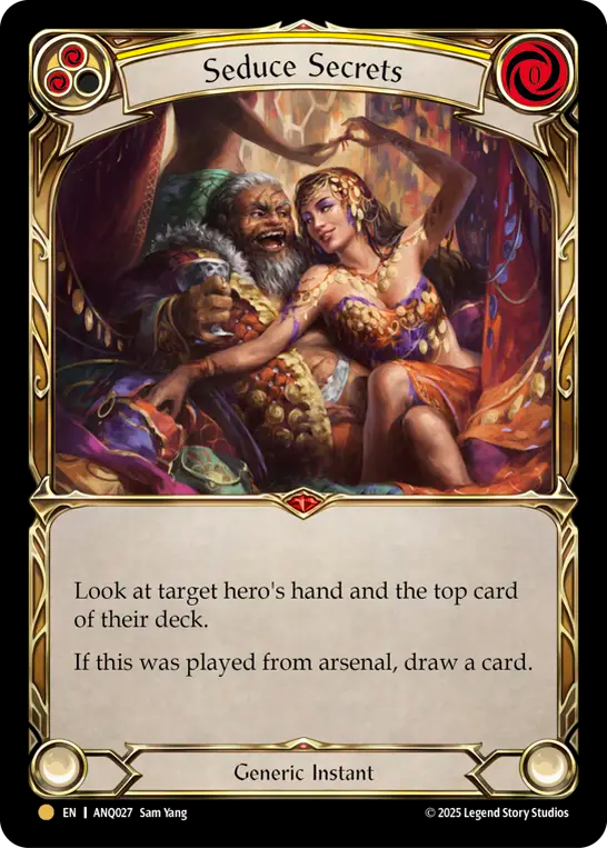 - Look at target hero's hand and the top card of their deck.{br}If this was played from arsenal, draw a card.