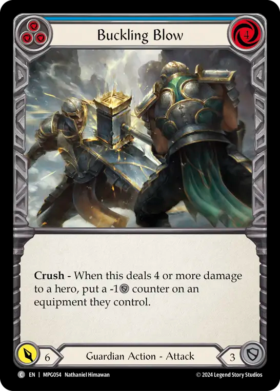 - Crush - If Buckling Blow deals 4 or more damage to a hero, put a -1{d} counter on target equipment they control.