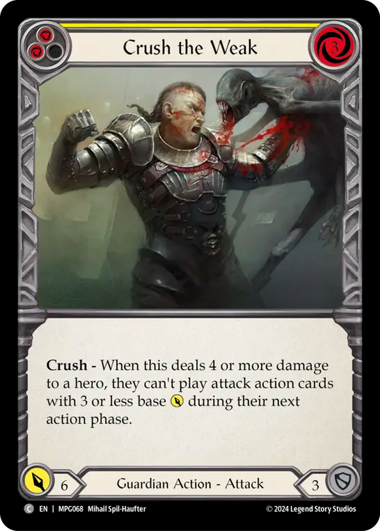 - Crush - If Crush the Weak deals 4 or more damage to a hero, they can't play attack action cards with 3 or less base {p} during their next action phase.