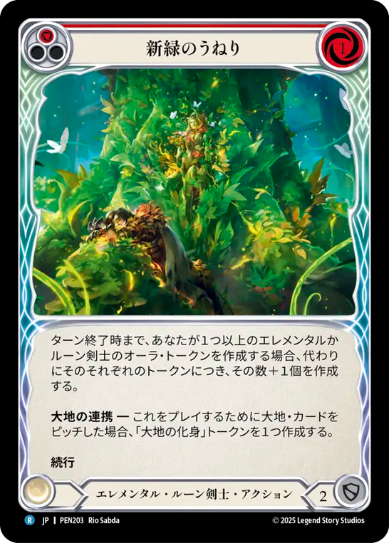 - ターン終了時まで、あなたが1つ以上のエレメンタルかルーン剣士のオーラ・トークンを作成する場合、代わりにそのそれぞれのトークンにつき、その数+1個を作成する。{br}**大地の連携** ― これをプレイするために大地・カードをピッチした場合、「大地の化身」トークンを1つ作成する。{br}**続行**
