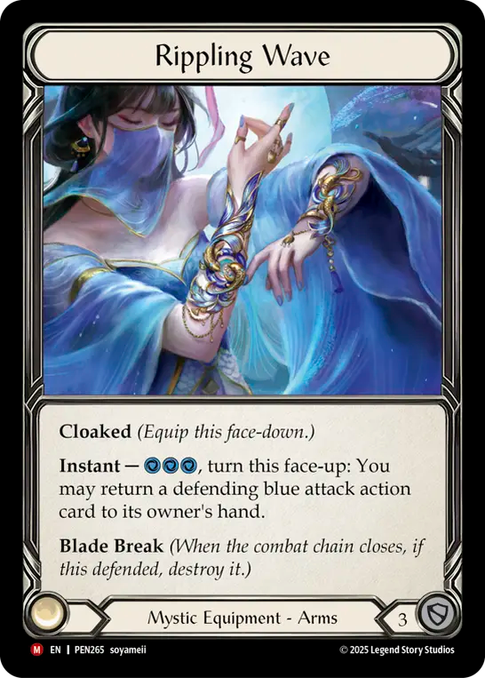 - **Cloaked** _(Equip this face-down.)_{br}**Instant** -- {c}{c}{c}, turn this face-up: You may return a defending blue attack action card to its owner's hand.{br}**Blade Break** _(When the combat chain closes, if this defended, destroy it.)_