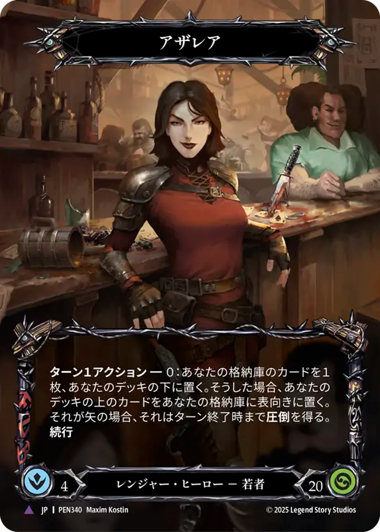 - **ターン1アクション**--0:あなたの格納庫のカードを1枚、あなたのデッキの下に置く。そうした場合、あなたのデッキの上のカードをあなたの格納庫に表向きに置く。それが矢の場合、それはターン終了時まで**圧倒**を得る。**続行**