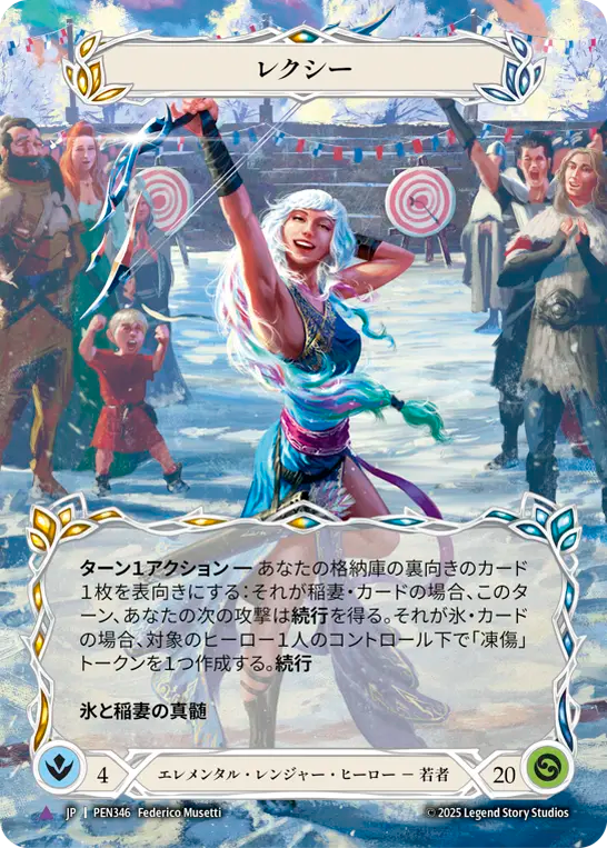 - **ターン1アクション**--あなたの格納庫の裏向きのカード1枚を表向きにする:それが稲妻・カードの場合、このターン、あなたの次の攻撃は**続行**を得る。それが氷・カードの場合、対象のヒーロー1人のコントロール下で「凍傷」トークンを1つ作成する。**続行**{br}**氷と稲妻の真髄**