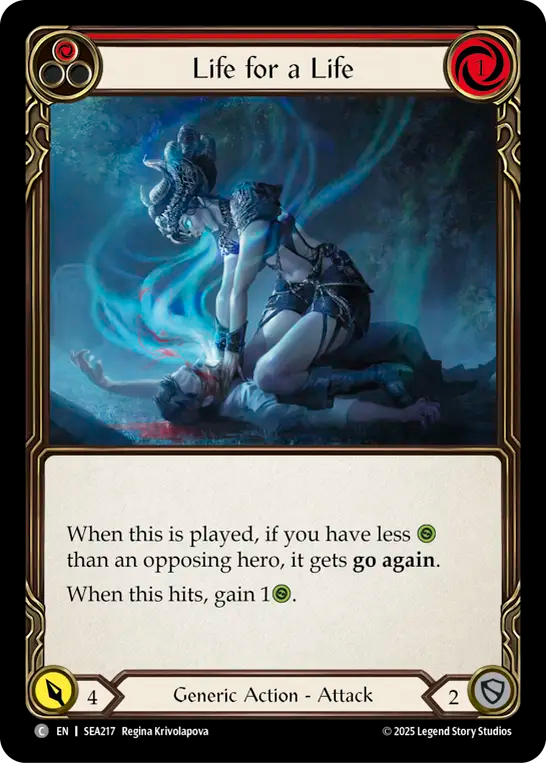 - If Life for a Life hits, gain 1{h}. When you play Life for a Life, if you have less {h} than an opposing hero, it gains go again.