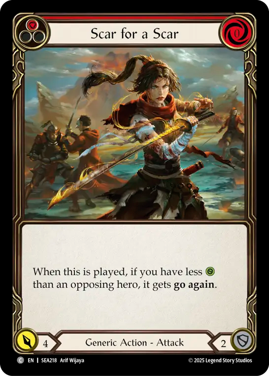 - When you play Scar for a Scar, if you have less {h} than an opposing hero, it gains go again.