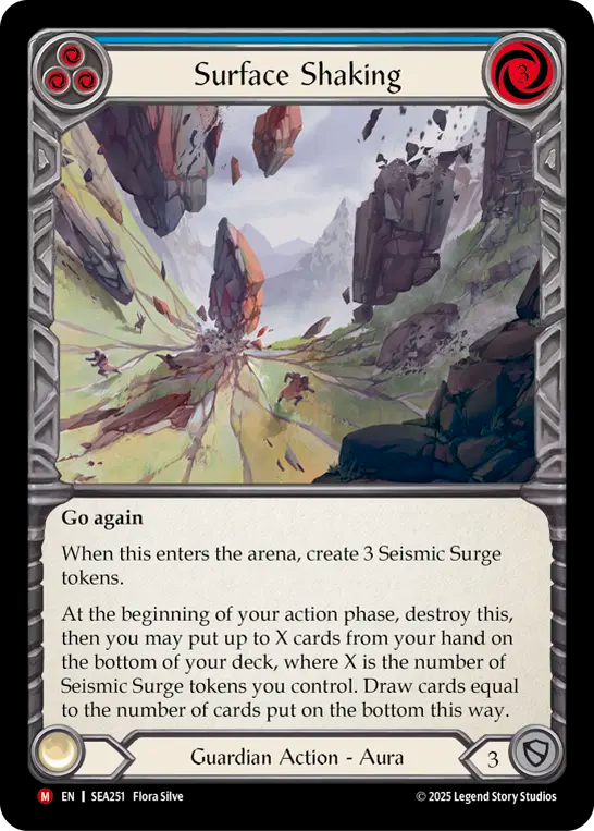 - Go again When this enters the arena, create 3 Seismic Surge tokens. At the beginning of your action phase, destroy this, then you may put up to X cards from your hand on the bottom of your deck, where X is the number of Seismic Surge tokens you control. Draw cards equal to the number of cards put on the bottom this way.