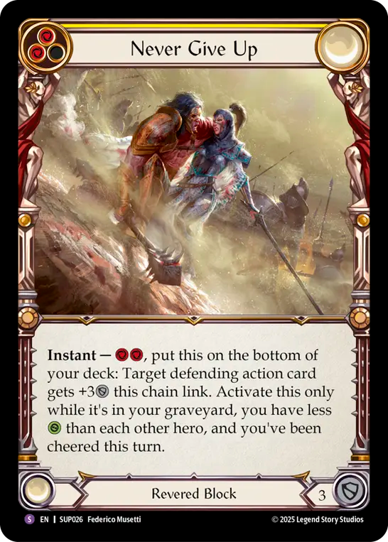 - Instant - {r}{r}, put this on the bottom of your deck: Target defending action card gets +3{d} this chain link. Activate this only while it's in your graveyard, you have less {h} than each hero, and you've been cheered this turn.