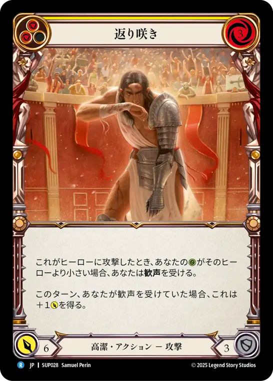 - When this attacks a hero, if you have less {h} than them, the crowd cheers you. If you've been cheered this turn, this gets +1{p}.