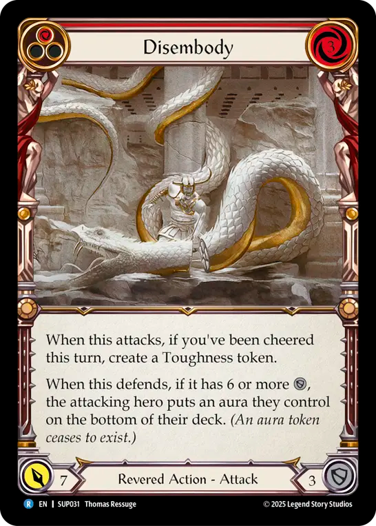 - When this attacks, if you've been cheered this turn, create a Toughness token. When this defends, if it has 6 or more {d}, the attacking hero puts an aura they control on the bottom of their deck.
