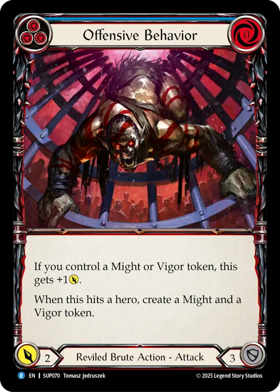 - If you control a Might or Vigor token, this gets +1{p}. When this hits a hero, create a Might and a Vigor token.