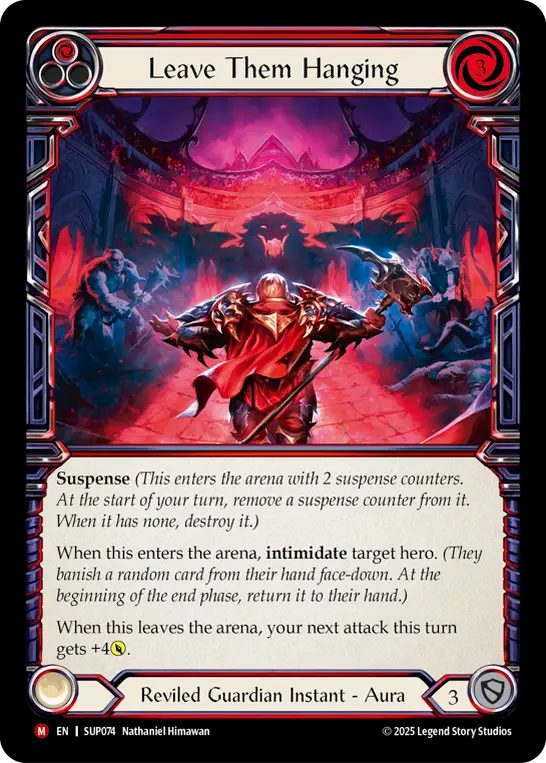 - Suspense When this enters or leaves the arena, intimidate target hero. When this leaves the arena, your next attack this turn gets +4{p}.